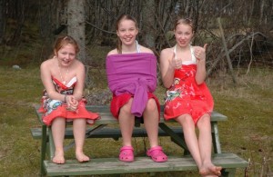 15. april: Godt med varme klær etter årets første dukkert for Astrid Havstein, Henny og Maren Kløven Lein. (Foto: Dagfinn Lein)