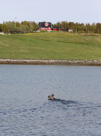 Til og med elgen ble overrasket av det strålende sommerværet onsdag, og la like godt ut på sin – trolig – første svømmetur.