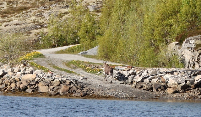 Som naturlig er siktet elgen seg inn mot båtutsettet, bommet litt, men vasset bort dit og tok seg opp den letteste vegen – før den forsvant opp i skogen.