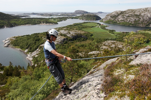 Og så var det klart for å rappellere, Eva Haagensen i farta i flotte omgivelser ved Hanshelleren på Strøm.