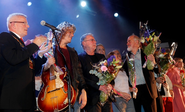 En stolt og imponert ordfører Morten Stene delte ut blomster til aktørene, fra venstre: Jon Lockert Rohde, Åge Aleksandersen og Arnulf Haga.