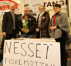 Under åpningen kom ordfører Olav Jørgen Bjørkås med blomster til Nesset fiskemottak. Bedriften stiller med stand på tross av at den ble slått konkurs onsdag.