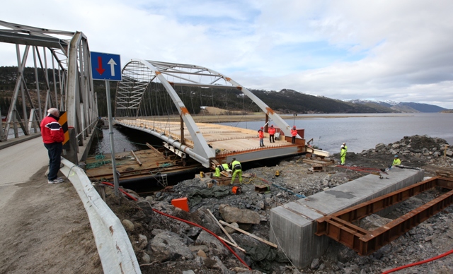 – Det ble mindre flo enn ventet natt til torsdag, så vi fikk ikke brua på land. Men nå ser det ut til å gå bra, sier byggeleder Dagfinn Wie i Statens vegvesen.