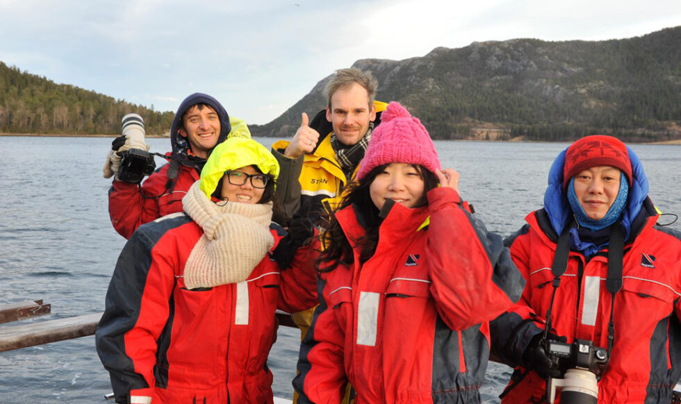 Reiseliv er i vekst i Kina, og nå kaster de sine øyne på Flatanger. Fra venstre: Jiang i Compass Travel, Jing Ling i PlusTour AS, Xialian Zheng i Conde Nast Traveler, Moiola Roberto i Conde Nast Traveler, Zhu Yiing i KBT Travel og Ola og Petter Thorsen i Wild Norway.