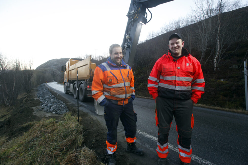 ‘- Vi fjerner stabbsteinene og gjør klart for autovern, sier Karstein Skomsvoll i Mesta og Victor Michelsen i Sverre Havik AS, som utfører jobben.