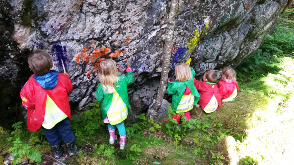 Her er kunstnerne bak maleriene som pynter opp berget ved stien til Storfjellet: Vangan barnehage!