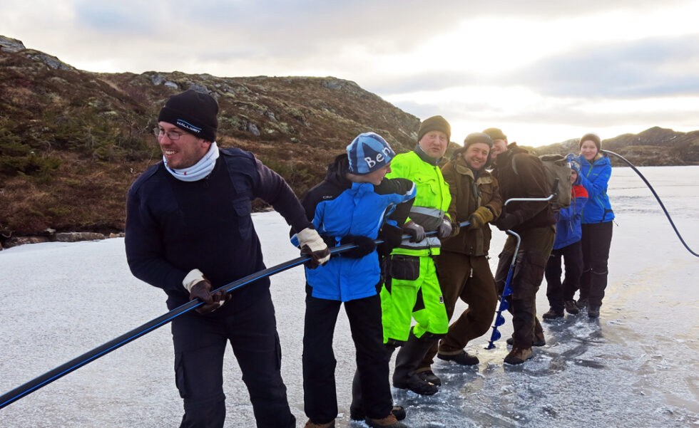 Derfor ble det satt i gang en storaksjon siste helg for å trekke en 600 meter lang ett-toms slange opp til Innvordvatnet. Åtte personer var i aksjon.