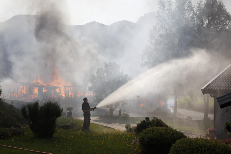 Brannvesenet vil også holde vakt i terrenget rundt gården, for å hindre brannen i å blusse opp der.