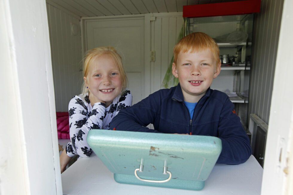 Magnus og Nora Nikoline sto i kiosken og tok betaling for kaker og kaffe. I tillegg hadde de ansvaret for alle pengene som ble lagt i pengeskrinet etter hvert som de strømmet inn. Jentene sto på i 2-3 timer og solgte flere runder med årer.