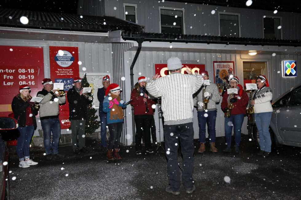 Butikken holdt åpent og serverte gløgg og pepperkaker, mens Flatanger musikkforening spilte kjente julesanger utenfor.
