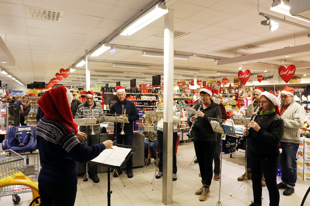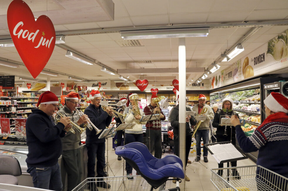 Flatanger musikkforening bidro til å skape julestemning på Spar-butikken på Lauvsnes lørdag. Her kan du høre smakebiter fra minikonserten.