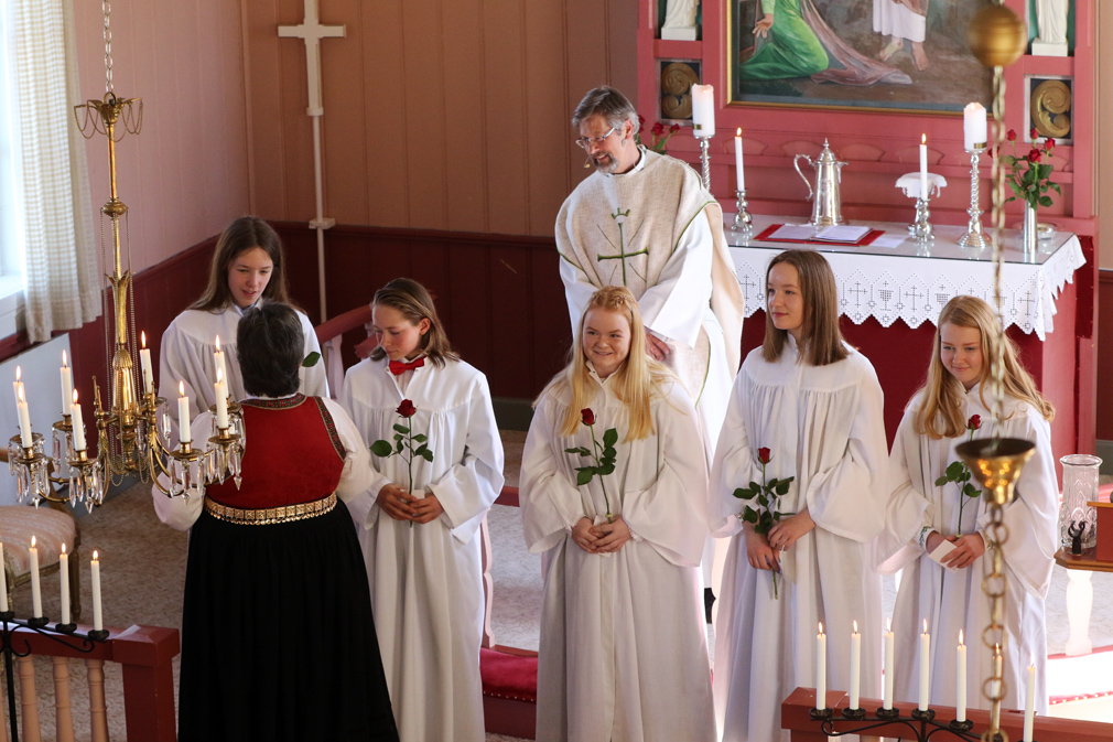 I år var det fem konfirmanter i Løvøy kirke: Brede Andreas Larsen Hunnestad, Ida Høstland Havn, Iselin Sæther Hårstadstrand, Aksel Vedvik og Bjørg Vedvik.