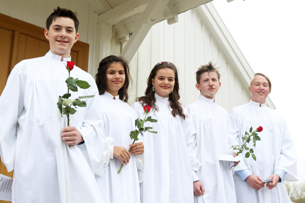 En nesten fullsatt kirke deltok i konfirmasjonsgudstjenesten. Menighetsrådet overrakte en rose til hver av konfirmantene, og leder Aud Høstland leste et dikt som hilsen til konfirmantene.