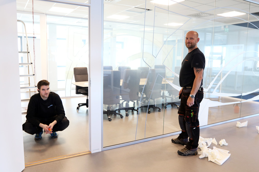 Håndverkere er i gang med siste innspurt i Havbruksparken før åpninga. Aleksander Olsen i Folla Elektro (til venstre) og Moren Lehn i Expoline lover å bli ferdig i tide..