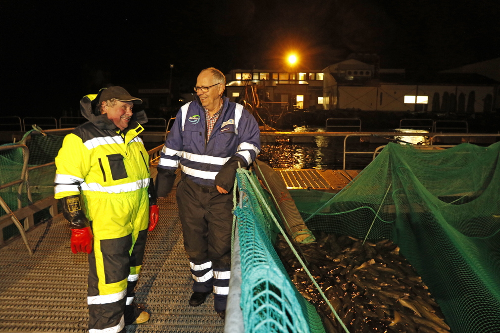 Ove Bakken (til venstre) sørger for at fisken blir pumpet opp fra ventemerdene. Til høyre Odd Devik.