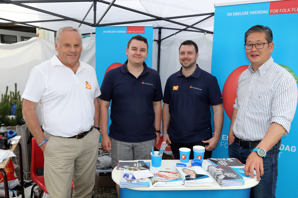 Selv om det er valgår, var det bare Frp som stilte med egen bod. De to førstekandidatene Espen Teigen og Tommy Skatland stilte opp på Lauvsnes, sammen med fylkesleder Einar Almaas (til venstre) og Lars Haagensen i Flatanger Frp. – Vi må være til stede der folk er, og vi ser vi er det eneste partiet som stiller her, sier Teigen.