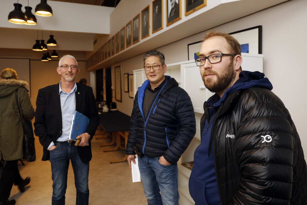 Marius Olsen er fornøyd med vedtaket. Her i samtale med ordfører Olav Jørgen Bjørkås og Lars Haagensen, som begge stemte i tråd med ønsket fra brannmannskapet.