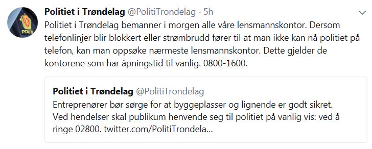 Politiet melder på Twitter at alle lensmannskontor vil bli bemannet søndag, for å ta imot henvendelser dersom telefonlinjer blir blokkert eller strømbrudd fører til at folk ikke kan nå politiet på telefon.
