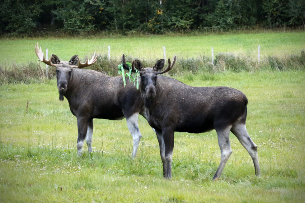 Da vi stoppet for å ta bilder av de to, forholdsvis tamme, elgoksene, fikk vi se noe som så ut som plastremse på geviret til den minste.