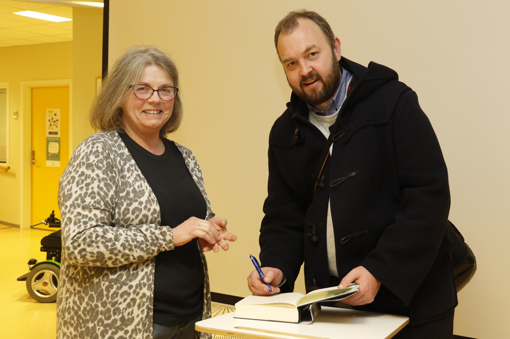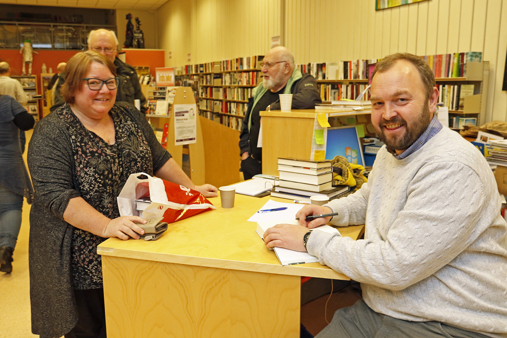 Flatanger historielag og Flatanger folkebibliotek arrangerte forfatterbesøket, og Torgersen Bokhandel var på plass med bøker for signering.
