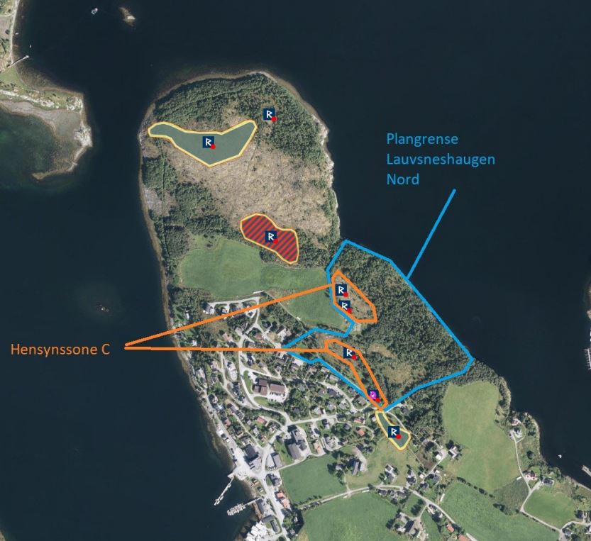 Flyfoto over Lauvsneset og Lauvsneshaugen. Det blåe feltet er det foreslåtte, nye boligfeltet.