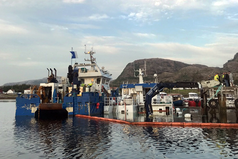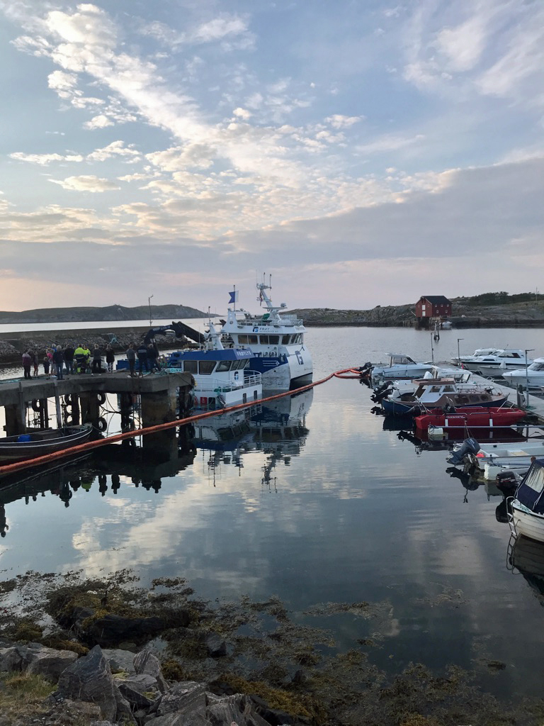 Det ble lagt ut nesten 500 meter med lenser i havna for å hindre at diesellekkasjen fra båten skulle spre seg.