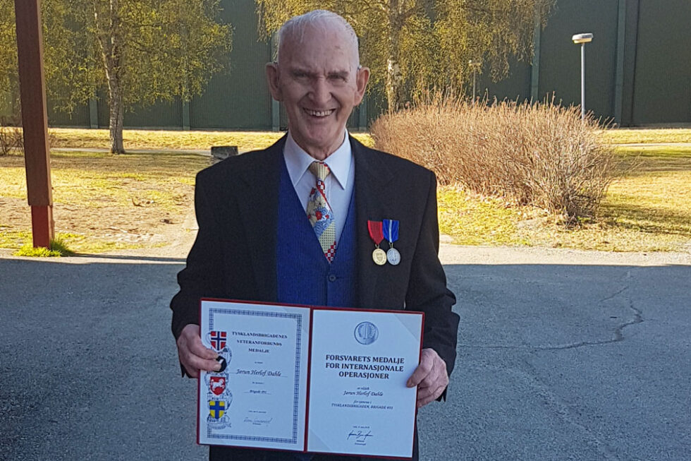 Jørund Dahle mottok medaljene dagen etter sin 90-årsdag – og 70 år etter at han deltok i Tyslandsbrigaden for første gang. Han tjenestegjorde der både i 1948 og 1949.