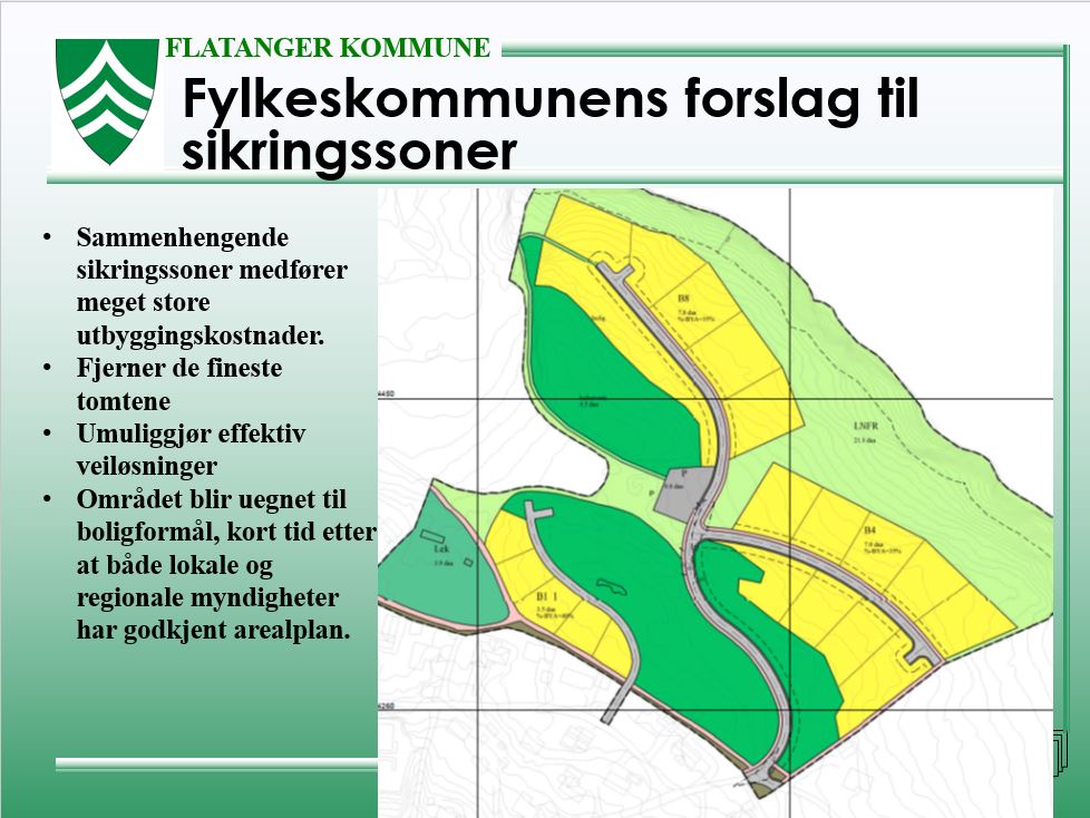 Slik blir feltet dersom kravene om hensynssone fra fylkeskommunen blir lagt inn. Antall tomter blir da redusert, og byggehøyde begrenset. (Lysark fra Flatanger kommune)