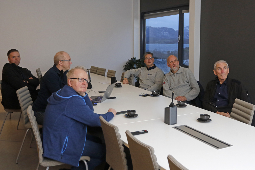 Stortingsrepresentanten Morten Ørsal Johansen møtte flere av havbruksaktørene i Flatanger, som her: Per Anton Løfsnæs i Bjørøya og Ove Løfsnæs i AQS. Videre rundt bordet: Geir-Tore Olsen, Lars Haagensen, Morten Ørsal Johansen og Odd Høstland.