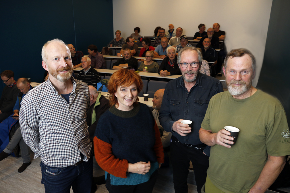 Sissel Thorsen var til stede og fortalte om filmen, som ble vist og debattert i amfiet på Namdal rensefisk. Fra venstre: Ove Løfsnæs, Sissel Thorsen, Reidar Lindseth og Anton Rikstad.