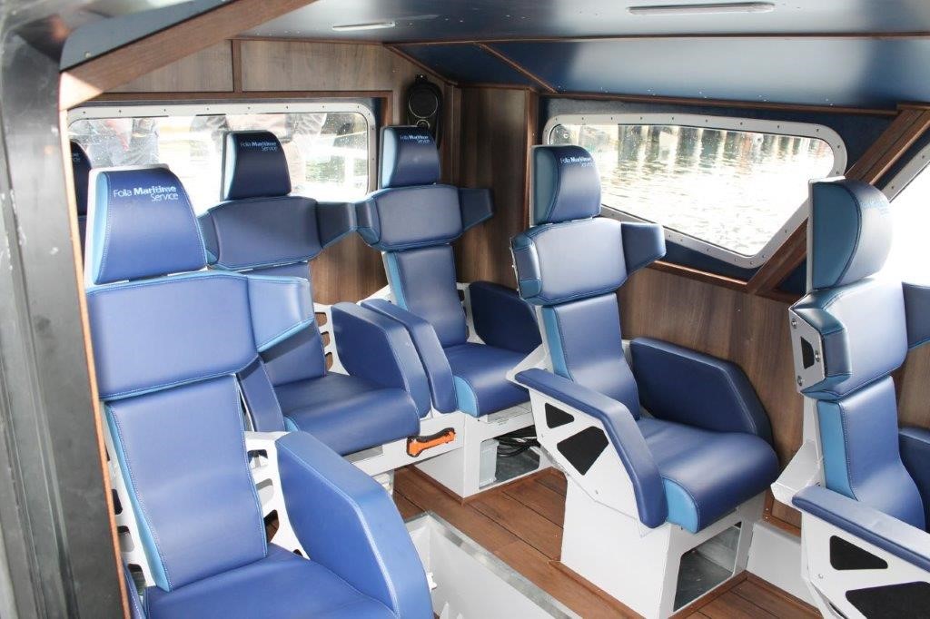 Båten er innredet med åtte spesialstoler med demping, utviklet av Folla Maritime og Innovation, og er beregnet for persontrafikk under tøffe forhold og høy fart.