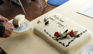 Prisen som beste smoltprodusent ble feiret med bløtkake. Fra venstre: Morten Strøm, Nils Strand, Hedda Charlotte Haugland, Harald Bakken, Arve Olsen, Maria Cassandra Strand, Svein G. Halmøy og Jonas Wiik.