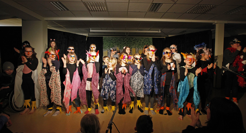 De mange små og litt større fuglene i barneteaterforestillingen «Katten og småfuglene», sjarmerte publikum i senk.