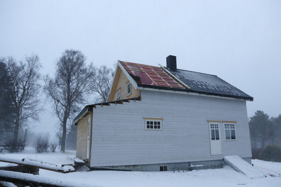Huset på Lauvsnes som ble skadet i den sterke vinden, er under restaurering og taket var nettopp lagt. Cirka kl. 1045 løsnet en del av takplatene, og nesten halvparten av platene på den ene sida blåste av.