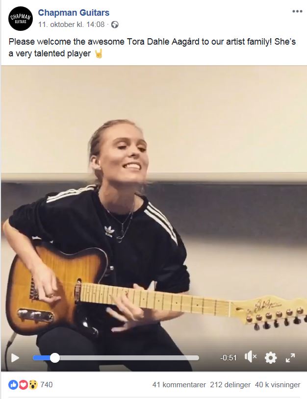 Chapman Guitars presenterer Tora på denne måten. 40.000 har allerede sett videosnutten der hun spiller på en av produsentens gitarer.