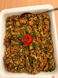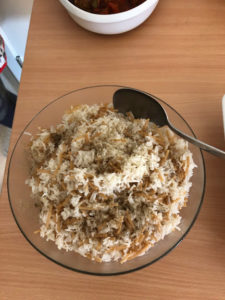 Lunsjen elevene skulle tilberede var et tradisjonelt måltid fra Syria. Kebab i tomatsaus, basmatiris med pasta, salat med bulgur og en vegetabilsk linsesuppe.