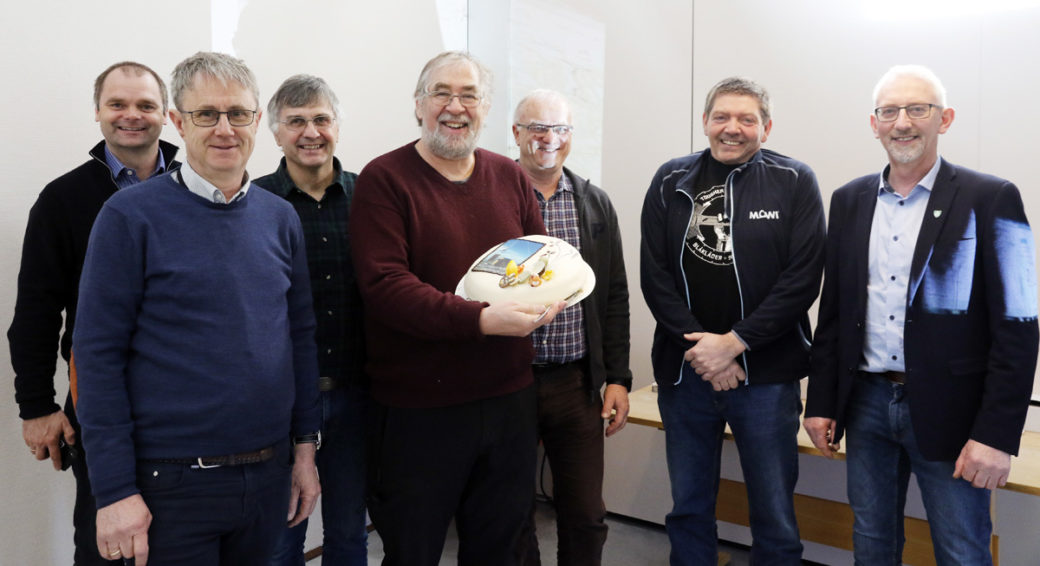 Det ble servert kake etter den offisielle åpninga av Hyllfjellet mobilmast. fra venstre: Pål Lukashagen, Bjørn Amundsen, Gunnar Kvaløysæter, Hans Petter Haukø, Knut Staven, Kent Jensen og Olav Jørgen Bjørkås.