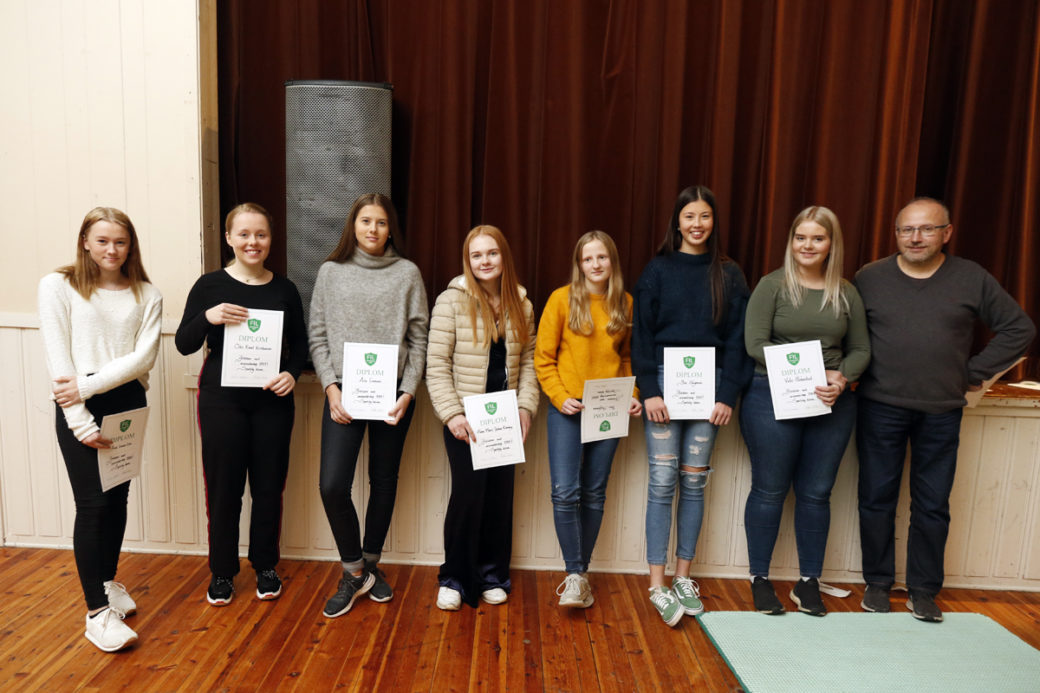 Jentelaget ble seriemester, og de som deltok på årsfesten fikk overrakt diplom for sin innsats. Fra venstre: Ariel Linnea Lein, Oda Ruud Kristiansen, Ada Evensen, Hanne Marie Tyldum Ribsskog, Thea Steffensen, Ylva Haagensen og Vida Hunnestad.