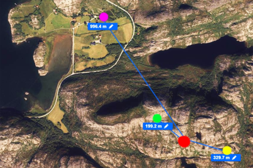 Illustrasjonen som Odd og Kristian Uran har laget, viser avstanden mellom den nyeste turbinen (rødt) og gården (lilla). Det grønne punktet er vindmølla som måtte fjernes i første konsesjonsrunde, mens det gule punktet er tidligere posisjon for vindturbinen som nå er flyttet nærmere Uran.