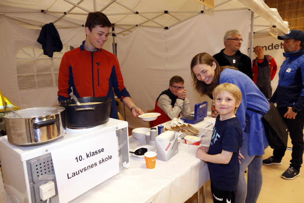 Sebastian Aune Edvardsen i neste års 10.klasse solgte fiskesuppe til inntekt for skoletur. Jesper Aune (6) synes fiskesuppa var skikkelig god. Bak mor Tina Elden.