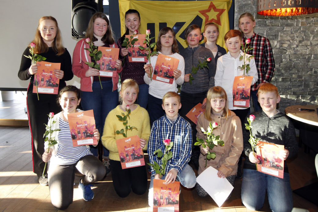 Deltakerne i årets UKM i Flatanger fikk roser og diplom. Foran fra venstre: Nadia Debes, Nora Nikoline Kløven Lein, Herman Sæther Haagensen, Henny Sæther og Magnus Tyldum Ribsskog. Bak fra venstre: Oda Ruud Kristiansen, Helga Bruheim, Ylva Haagensen, Johannes Lein, Sverre Størker Angen Wibstad, Hanne Marie Tyldum Ribsskog, Leon Leander Lein, og Lavrans Lein.