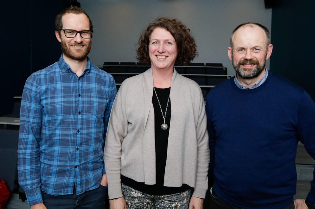 Deltakerne på åpninga av avlsanlegget fikk også et faglig dypdykk i fiskehelse og genetikk, med fra venstre Tim Knutsen, Trine Galloway og Arnfinn Aunsmo.