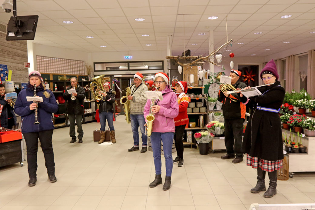 Nærbutikken fikk også besøk av korpset tirsdag kveld.