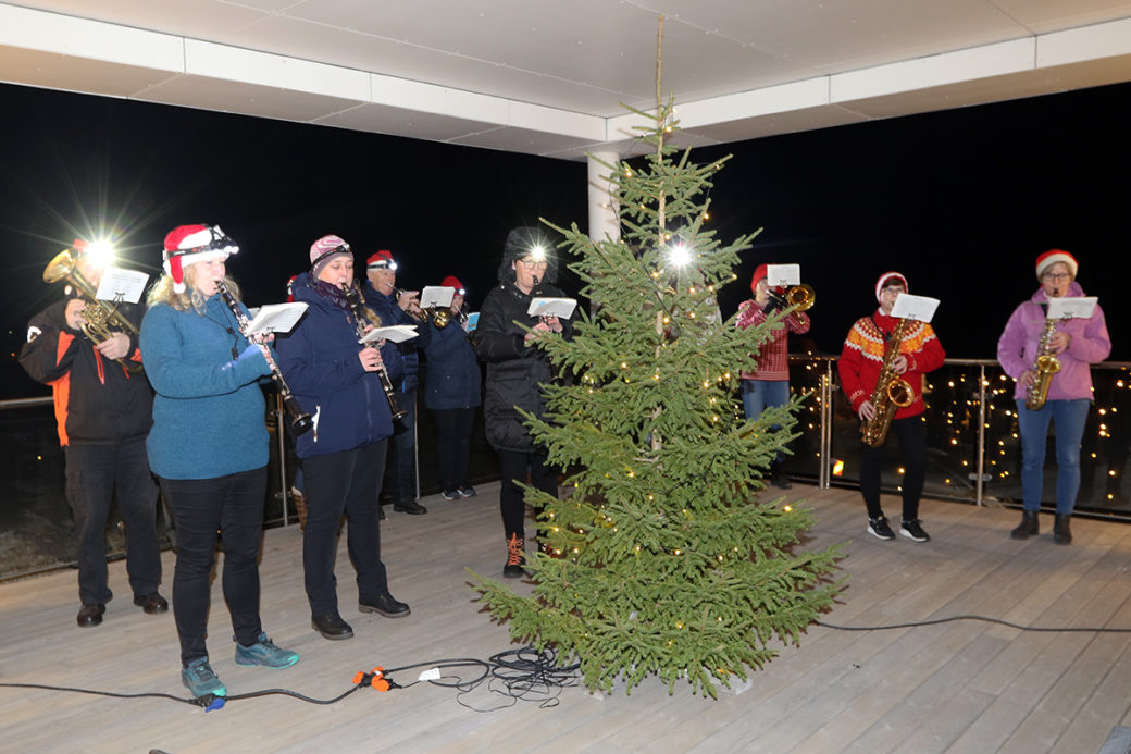 Juletreet var på plass på terrassen på nyfløya, der korpset spilte julesanger for beboerne på innsida.
