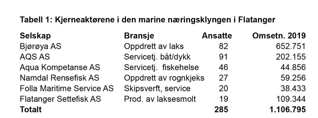 Kjernevirksomheten i Flatanger er oppdrett av laks med tilhørende aktiviteter. Kompetanse, kapital, infrastruktur og samarbeid over tid, er bygd opp rundt denne profilen. I tillegg bidrar et sterkt lokalt eierskap til at kapitalen reinvesteres lokalt i nye virksomheter, som igjen bidrar til at det stadig utvikles ny aktivitet og flere arbeidsplasser. Store aktører som Mowi og SalMar har også sterk tilstedeværelse i kommunen, men har ikke den sammen lokale forankringen, og regnes derfor ikke inn blant kjerneaktørene.