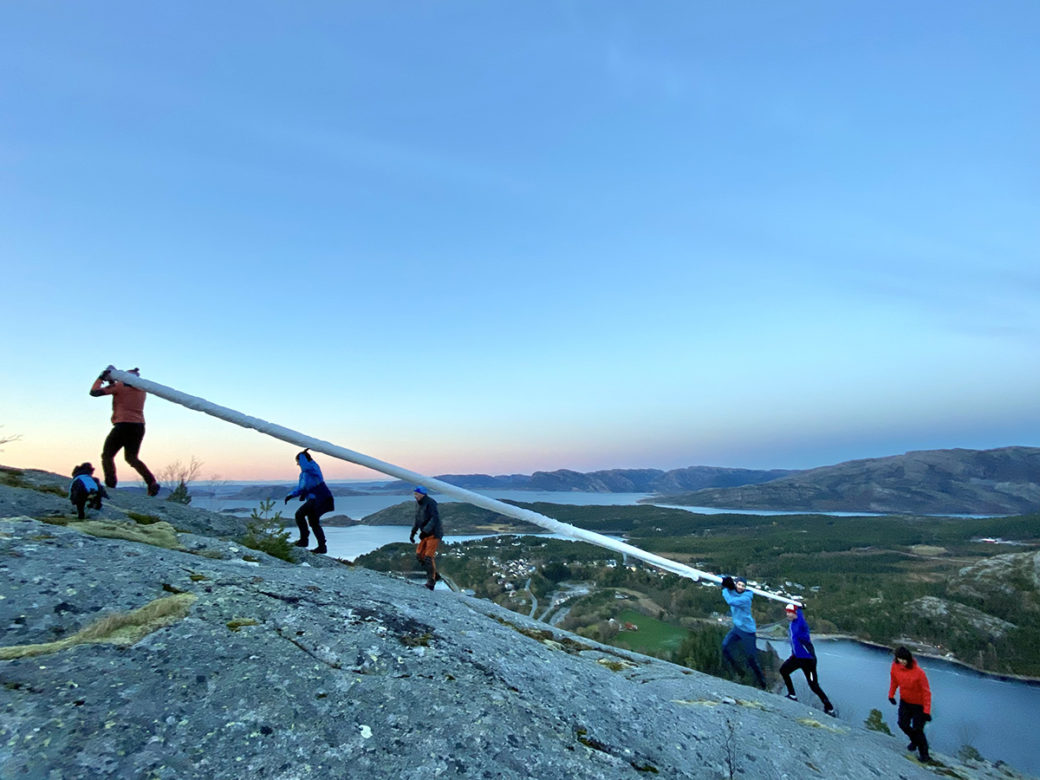 Ei 12 meter lang flaggstang ble båret opp på Storfjellet, og den er nå montert og blir søndag dekorert med lys. (Foto: Jens Martin Olsen)