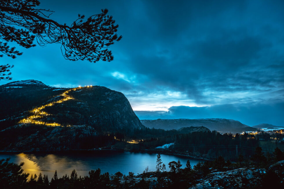 600 dugnadstimer er lagt ned for å få på plass 41 lyspunkt fra foten av fjellet til toppen. Det er kappet og båret opp 1.300 meter med kabel.