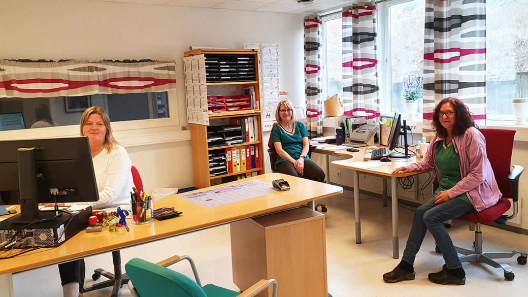 Legekontoret har også tatt sine forholdsregler, og det er opprettet smitteteam og sporingsteam. Fra venstre: Hjøri Meland Aakervik, Lise Søreng Mork og Lena Canborn. (Foto: Liv Brønstad)