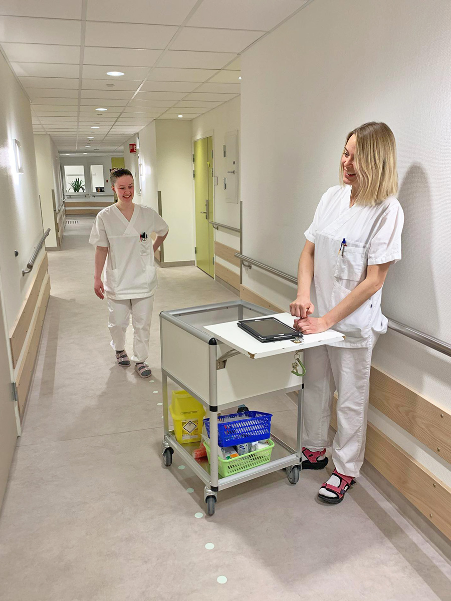 Maren Grønnerøe Sæther på medisinrunde, Matilde Hanssen venter på å få passere i forhold til en-metersregelen.