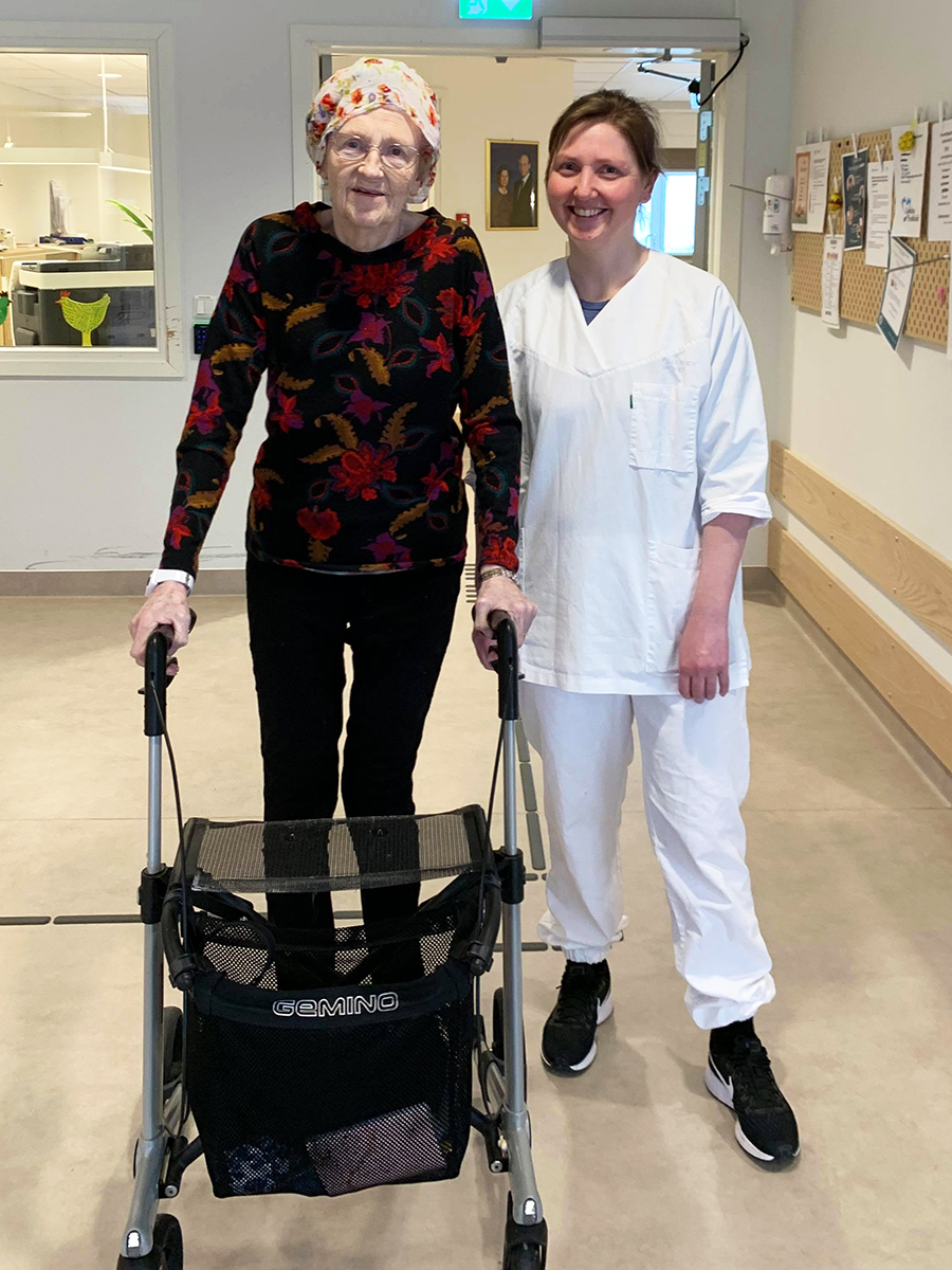 Fysioterapeut Torunn Strøm får nå komme inn på huset, ikle seg arbeidstøy og trene sammen med beboerne. Her er det Reidun Moe som får en gåtur sammen med Torunn.